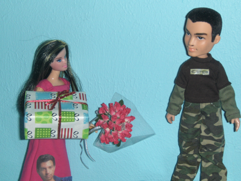 プレゼントと花持っている。