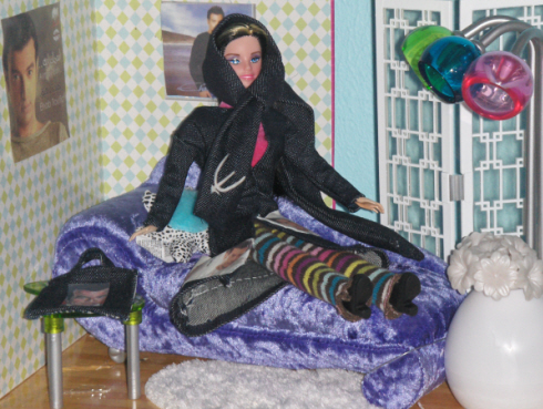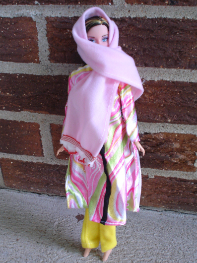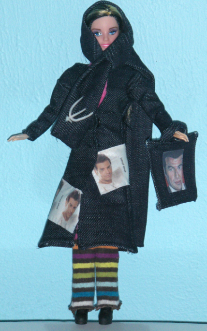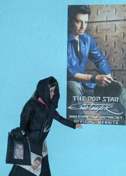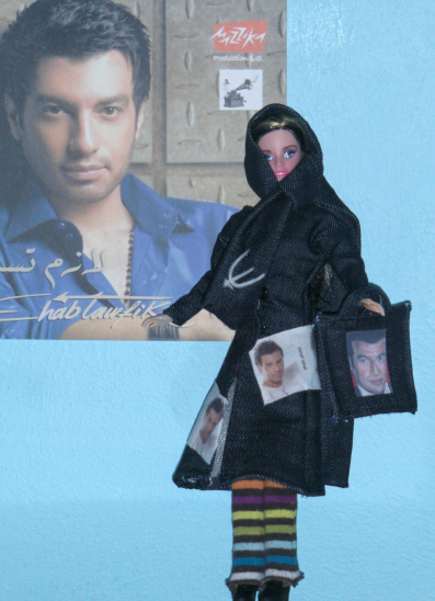 あのね、Ehab Tawficの写真くっつけた服作ってEhabファンのアラブ女性にしてみました。(写真、クリックで拡大になります。Ehabの写真つきデニムジャケットにEhabロゴつきスカーフ、Ehabバッグ)